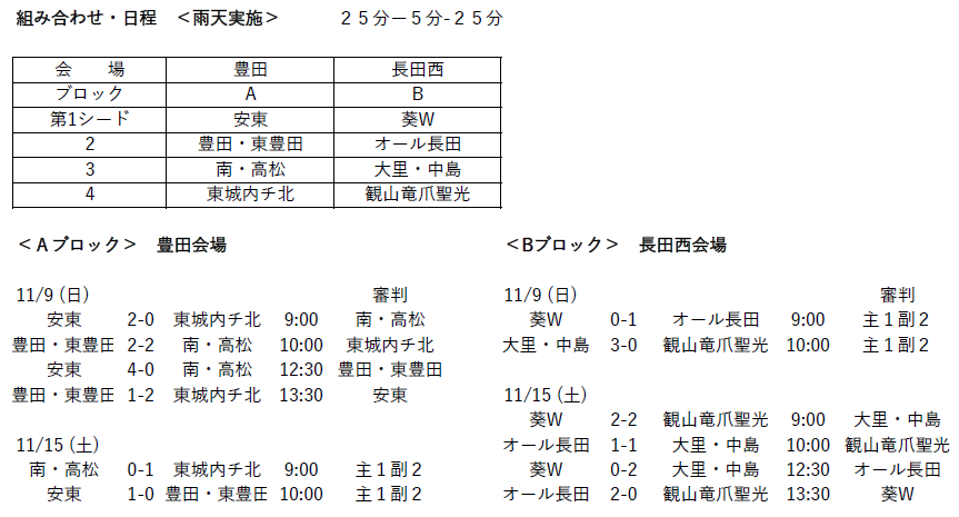 | 期日 | 令和5年11月9日(日)~11月22日(土) 予選リーグ 11月9日(日)、15日(土)、16日(日) 順位決定戦 11月22日(土) |