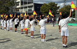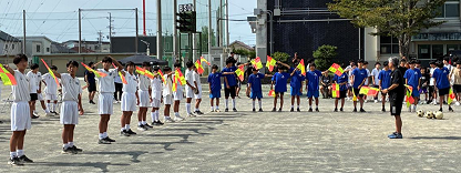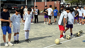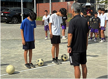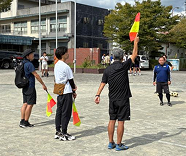 競技規則を選手(生徒)に正しく理解していただくために、まず会議室にて講習会を行うことでサッカー4級審判員資格を取得いただきました。そのあとグランドにてオフサイドポジションとボールのイン・アウトの確認と副審のフラッグシグナル確認を実際にフラッグを使ってレクチャー交えて行いました。