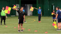 競技規則を選手(生徒)に正しく理解していただくために、まず会議室にて講習会を行うことでサッカー4級審判員資格を取得いただきました。そのあとグランドにてオフサイドポジションとボールのイン・アウトの確認と副審のフラッグシグナル確認を実際にフラッグを使ってレクチャー交えて行いました。