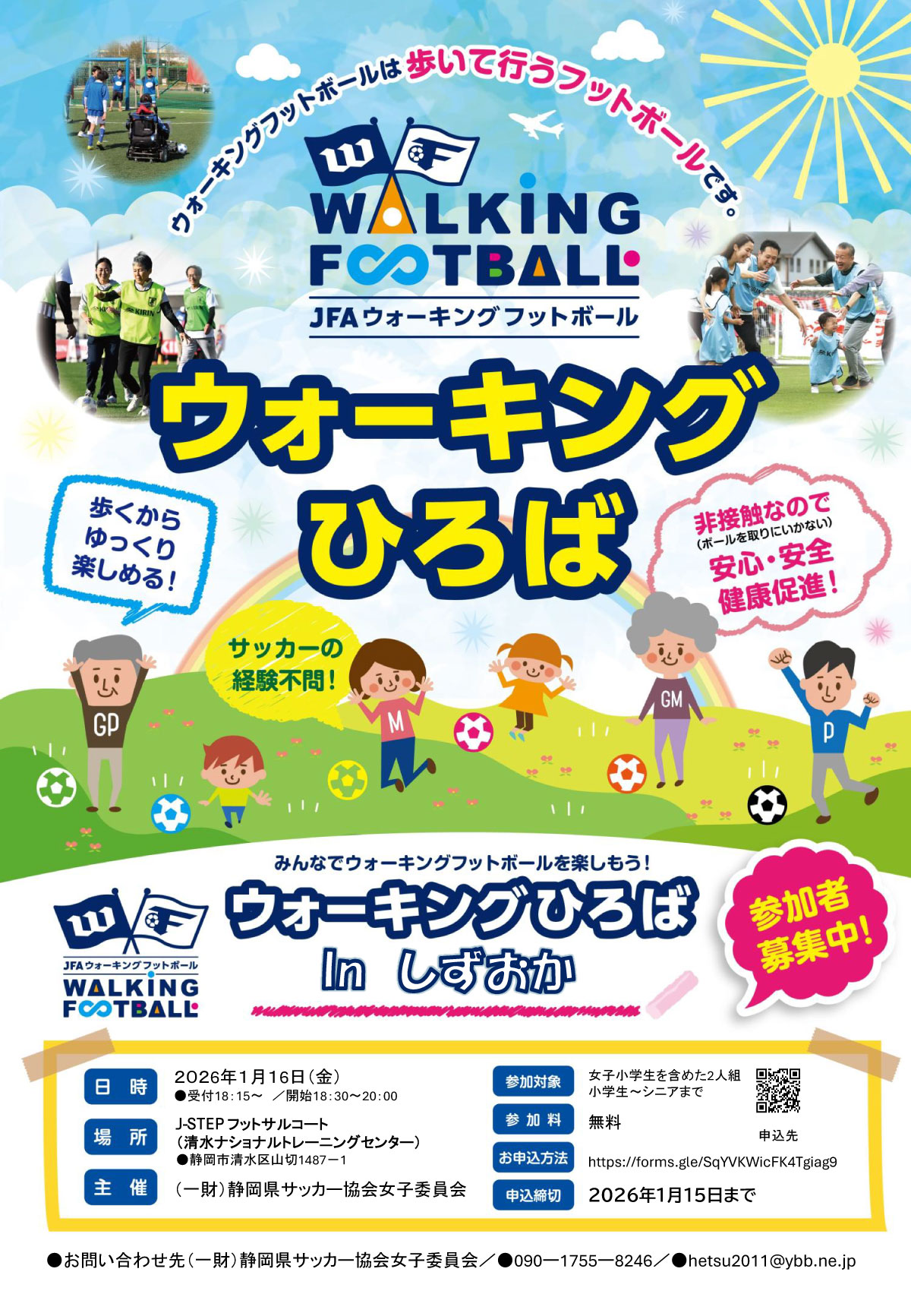 ウォーキングひろば in しずおか (開催告知) 2026.01.09 非接触で歩きながらゆっくり楽しめるウォーキングフットボールを体験して下さい!「ウォーキングひろば inしずおか」が2026年1月16日(金)に清水ナショナルトレーニングセンターで開催されます。参加費無料、親子で楽しめる内容となっていますので、興味のある方の積極的なご参加をお願いします。 お申込みフォームはこちら