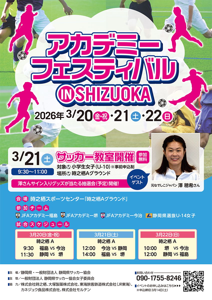 アカデミーフェスティバル IN SHIZUOKA 2026.02.17 アカデミーフェスティバルは、アカデミー福島との繋がりを絶つことなく良きサッカー仲間として交流を続けることを目的として昨年度よりスタートしました。試合観戦はもちろんのこと、サッカー教室にぜひ多くの女の子(U-10)に参加して頂きたいと思っています。(初心者大歓迎) 申し込みはこちらから