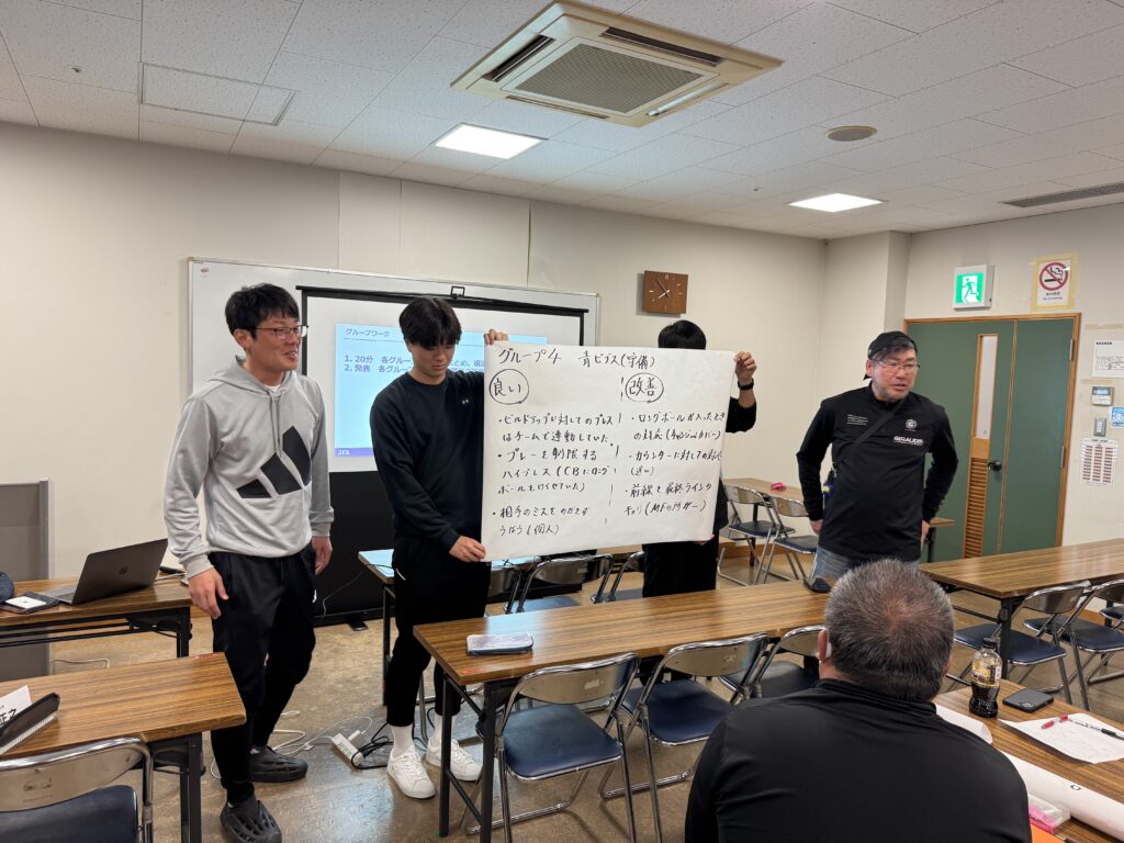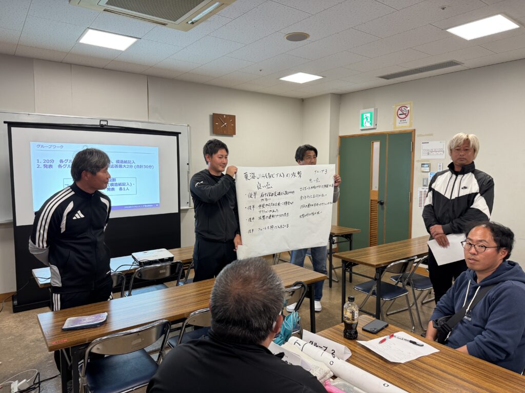 テーマは分析:VTRを見ながら基本的な講義の後 グループに別れてディスカッション形式での分析で、良かった点と改善点をまとめて発表するというものです。