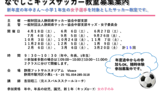 女子 2026年度 なでしこキッズサッカー教室 参加者募集開始 新年度の年中さん〜小学1年生の女子を対象とした「なでしこキッズサッカー教室」が参加者の募集を始めました。静岡市駿河区小黒にある静岡フットサルスタジアムVivaceで、年間15回の教室となります。要項をご確認の上、申込みをお願い致します。 要... 2026.04.08 女子